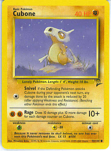 [C] Snivel - If the Defending Pokemon attacks Cubone during your opponent's next turn, any damage done by the attack is reduced by 20 (after applying Weakness and Resistance). (Benching either Pokemon ends this effect.)