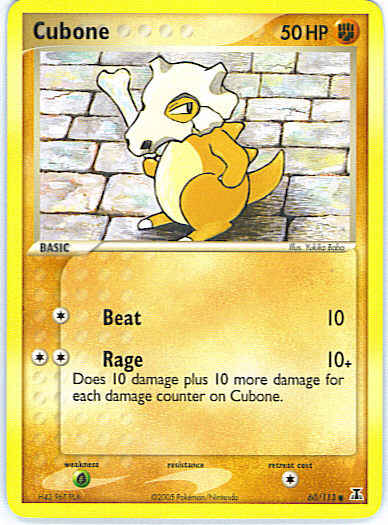 | Type | Fighting | | Pokemon serie | Delta Species | | Stadie | Basic | | HP | 50 | | Sjældenhed | Common | | Tilbagetrækning | 1 | | Svaghed | G | | Kortnummer | 60 | | Evne | [C] Beat (10) [CC] Rage (10+) Does 10 damage plus 10 more damage for each damage counter on Cubone. | | Evne2 | [C] Beat (10) [CC] Rage (10+) Does 10 damage plus 10 more damage for each damage counter on Cubone. | | Kunstner | Yukiko Baba |