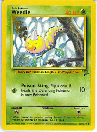 | Type | Grass | | Pokemon serie | Base Set 2 | | Stadie | Basic | | HP | 40 | | Sjældenhed | Common | | Tilbagetrækning | 1 | | Svaghed | R | | Kortnummer | 100 | | Evne |