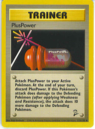 Attach PlusPower to your Active Pokemon. At the end of your turn, discard PlusPower. If this Pokemon's attack does damage to the defending Pokemon (after applying Weakness and Resistance), the attack does 10 more damage to the defender.