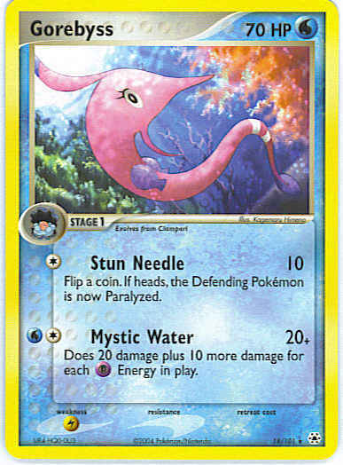 | Type | Water | | Pokemon serie | Hidden Legends | | Stadie | Stage 1 | | HP | 70 | | Sjældenhed | Rare | | Svaghed | L | | Kortnummer | 18 | | Evne | [C] Stun Needle (10) Flip a coin. If heads, the Defending Pokemon is now Paralyzed. [CW] Mystic Water (20+) Does 20 damage plus 10 more for each P Energy in play. | | Evne2 | [C] Stun Needle (10) Flip a coin. If heads, the Defending Pokemon is now Paralyzed. [CW] Mystic Water (20+) Does 20 damage plus 10 more for each P Energy in play. | | Kunstner | Kagemaru Himeno |