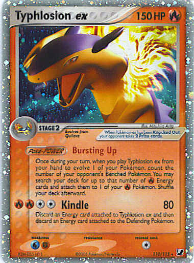 | Type | Fire | | Pokemon serie | Unseen Forces | | Stadie | Stage 2 | | HP | 150 | | Sjældenhed | Ultra-Rare | | Tilbagetrækning | 1 | | Svaghed | WF | | Kortnummer | 110 | | Evne | [CCRR] Kindle (80) Discard an Energy card attach to Typhlosion EX and then discard an Energy card attached to the Defending Pokemon. | | Evne2 | [CCRR] Kindle (80) Discard an Energy card attach to Typhlosion EX and then discard an Energy card attached to the Defending Pokemon. | | Kunstner | Mitsuhiro Arita |