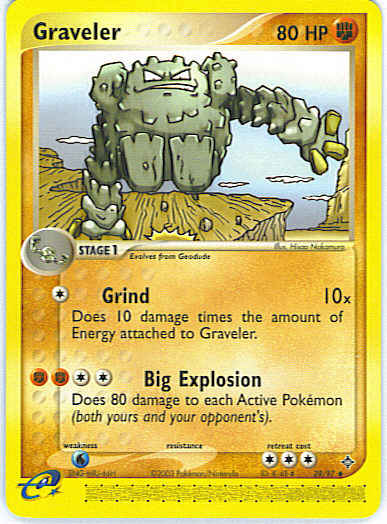 | Type | Fighting | | Pokemon serie | Dragon | | Stadie | Stage 1 | | HP | 80 | | Sjældenhed | Uncommon | | Tilbagetrækning | 3 | | Svaghed | W | | Kortnummer | 29 | | Evne | [C] Grind (10x) Does 10 damage times the amount of Energy attached to Graveler. [CCFF] Big Explosion - Does 80 damage to each Active Pokemon (both yours and your opponent's). | | Evne2 | [C] Grind (10x) Does 10 damage times the amount of Energy attached to Graveler. [CCFF] Big Explosion - Does 80 damage to each Active Pokemon (both yours and your opponent's). | | Kunstner | Hisao Nakamura |
