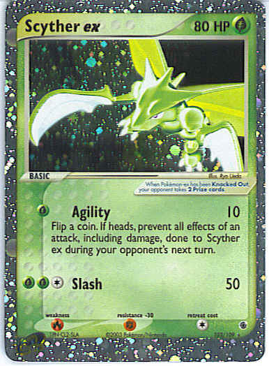 | | Evne2 | [G] Agility (10) Flip a coin. If heads, prevent all effects of an attack, including damage, done to Scyther ex during your opponent's next turn. [CGG] Slash (50)