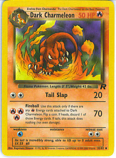 | Type | Fire | | Pokemon serie | Team Rocket | | Stadie | Stage 1 | | HP | 50 | | Sjældenhed | Uncommon | | Tilbagetrækning | 2 | | Svaghed | W | | Kortnummer | 32 | | Evne |