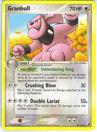 | Type | Colorless | | Pokemon serie | Unseen Forces | | Stadie | Stage 1 | | HP | 70 | | Sjældenhed | Uncommon | | Tilbagetrækning | 2 | | Svaghed | F | | Kortnummer | 39 | | Evne | [CC] Crushing Blow (30) Flip a coin. If heads, discard an Energy attached to the Defending Pokemon. [CCCC] Double Lariat (50x) Flip 2 coins. This attack does 50 damage times the number of heads. | | Evne2 | [CC] Crushing Blow (30) Flip a coin. If heads, discard an Energy attached to the Defending Pokemon. [CCCC] Double Lariat (50x) Flip 2 coins. This attack does 50 damage times the number of heads. | | Kunstner | Midori Harada |
