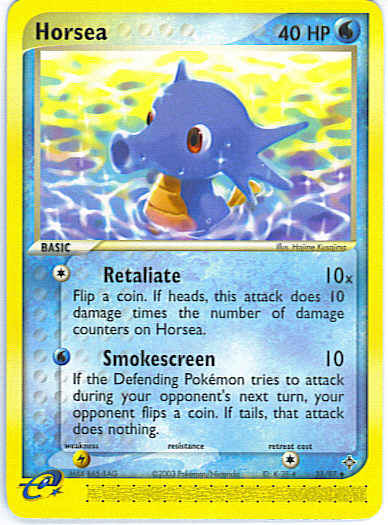 | Type | Water | | Pokemon serie | Dragon | | Stadie | Basic | | HP | 40 | | Sjældenhed | Uncommon | | Tilbagetrækning | 1 | | Svaghed | L | | Kortnummer | 33 | | Evne | [C] Retaliate (10x) Flip a coin. If heads, this attack does 10 damage times the number of damage counters on Horsea. [W] Smokescreen (10) If the Defending Pokemon tries to attack during your opponent's next turn, your opponent flips a coin. If tails, that attack does nothing. | | Evne2 | [C] Retaliate (10x) Flip a coin. If heads, this attack does 10 damage times the number of damage counters on Horsea. [W] Smokescreen (10) If the Defending Pokemon tries to attack during your opponent's next turn, your opponent flips a coin. If tails, that attack does nothing. | | Kunstner | Hajime Kusajima |