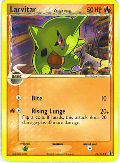| Type | Fire | | Pokemon serie | Delta Species | | Stadie | Basic | | HP | 50 | | Sjældenhed | Common | | Tilbagetrækning | 1 | | Svaghed | W | | Kortnummer | 73 | | Evne | [C] Bite (10) [CR] Rising Lunge (20+) Flip a coin. If heads, this attack does 20 damage plus 10 more damage. | | Evne2 | [C] Bite (10) [CR] Rising Lunge (20+) Flip a coin. If heads, this attack does 20 damage plus 10 more damage. | | Kunstner | Hajime Kusajima |