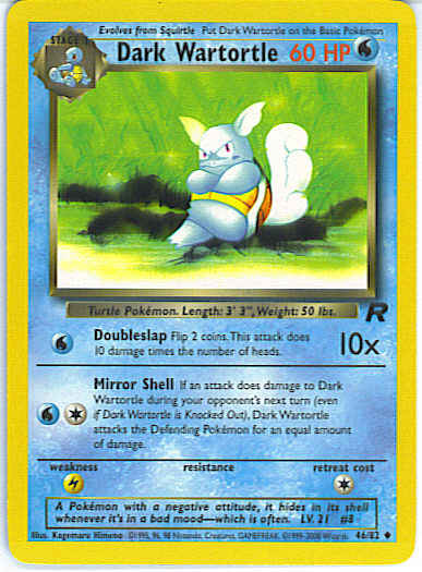 [CW] Mirror Shell - If an attack does damage to Dark Wartortle during your opponent's next turn (even if Dark Wartortle is Knocked Out), Dark Wartortle attacks the Defending Pokemon for an equal amount of damage.