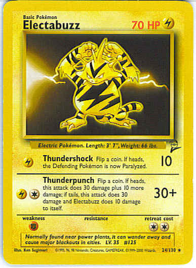[CL] Thunderpunch (30+) Flip a coin. If heads, this attack does 30 damage plus 10 more damage. If tails, this attack does 30 damage and Electabuzz does 10 damage to itself.