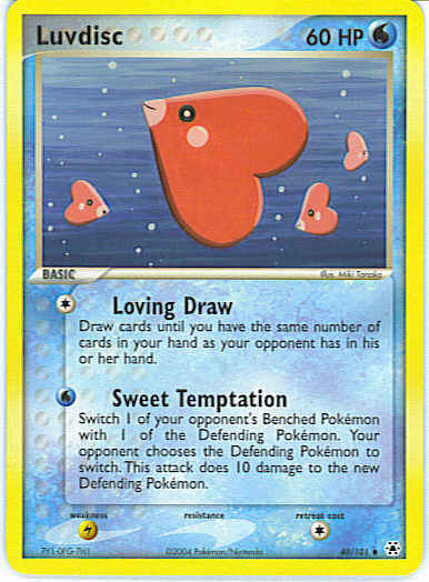 | Evne | [C] Loving Draw - Draw cards until you have the same number of cards in your hand as your opponent has in his or her hand. [W] Sweet Temptation - Switch 1 of your opponent's Benched Pokemon with 1 of the Defending Pokemon. Your opponent chooses the Defending Pokemon to switch. This attack does 10 damage to the new Defending Pokemon. |