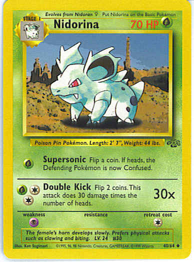 | Type | Grass | | Pokemon serie | Jungle | | Stadie | Stage 1 | | HP | 70 | | Sjældenhed | Uncommon | | Tilbagetrækning | 1 | | Svaghed | P | | Kortnummer | 40 | | Evne |