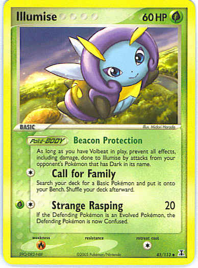 | Type | Grass | | Pokemon serie | Delta Species | | Stadie | Basic | | HP | 60 | | Sjældenhed | Uncommon | | Tilbagetrækning | 1 | | Svaghed | R | | Kortnummer | 45 | | Evne | , including damage, done to Illumise by attacks from your opponent's Pokemon that has Dark in its name. (Poke-BODY)