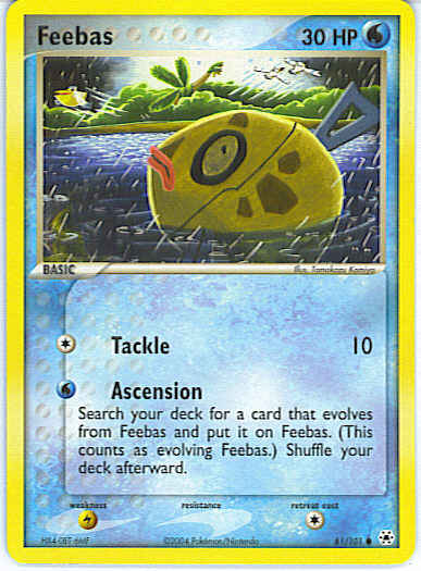 | Type | Water | | Pokemon serie | Hidden Legends | | Stadie | Basic | | HP | 30 | | Sjældenhed | Common | | Tilbagetrækning | 1 | | Svaghed | L | | Kortnummer | 61 | | Evne | [C] Tackle (10) [W] Ascension - Search your deck for a card that evolves from Feebas and put it on Feebas. (This counts as evolving Feebas.) Shuffle your deck afterward. | | Evne2 | [C] Tackle (10) [W] Ascension - Search your deck for a card that evolves from Feebas and put it on Feebas. (This counts as evolving Feebas.) Shuffle your deck afterward. | | Kunstner | Tomokazu Komiya |