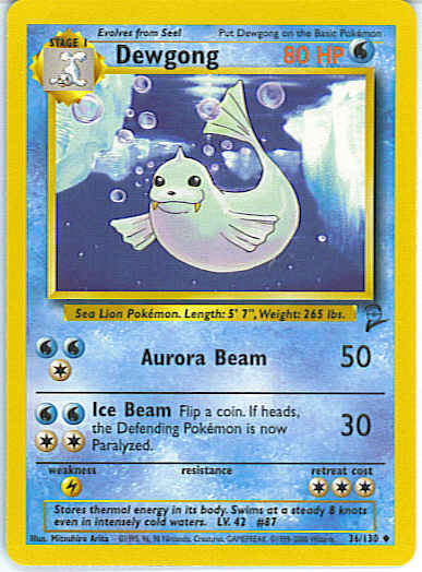 | Type | Water | | Pokemon serie | Base Set 2 | | Stadie | Stage 1 | | HP | 80 | | Sjældenhed | Uncommon | | Tilbagetrækning | 3 | | Svaghed | L | | Kortnummer | 36 | | Evne |