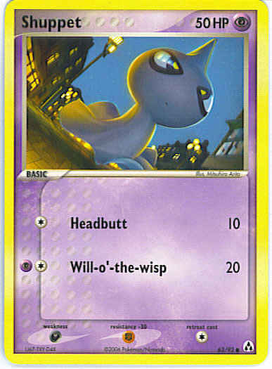 | Type | Psychic | | Pokemon serie | Legend Maker | | Stadie | Basic | | HP | 50 | | Sjældenhed | Common | | Tilbagetrækning | 1 | | Modstand | F | | Svaghed | D | | Kortnummer | 63 | | Evne | [C] Headbutt (10) [CP] Will-o'-the-wisp (20) | | Evne2 | [C] Headbutt (10) [CP] Will-o'-the-wisp (20) | | Kunstner | Mitsuhiro Arita |