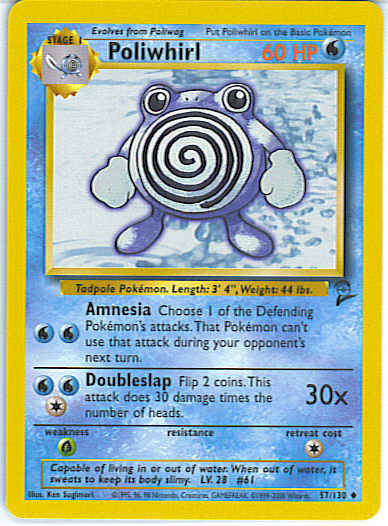 | Type | Water | | Pokemon serie | Base Set 2 | | Stadie | Stage 1 | | HP | 60 | | Sjældenhed | Uncommon | | Tilbagetrækning | 1 | | Svaghed | G | | Kortnummer | 57 | | Evne |