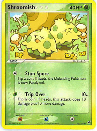 | Type | Grass | | Pokemon serie | Deoxys | | Stadie | Basic | | HP | 40 | | Sjældenhed | Common | | Tilbagetrækning | 1 | | Modstand | W | | Svaghed | R | | Kortnummer | 72 | | Evne | [C] Stun Spore - Flip a coin. If heads, the Defending Pokemon is now Paralyzed. [G] Trip Over (10+) Flip a coin. If heads, this attack does 10 damage plus 10 more damage. | | Evne2 | [C] Stun Spore - Flip a coin. If heads, the Defending Pokemon is now Paralyzed. [G] Trip Over (10+) Flip a coin. If heads, this attack does 10 damage plus 10 more damage. | | Kunstner | Kanako Eo |