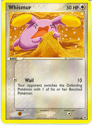 | Type | Colorless | | Pokemon serie | Hidden Legends | | Stadie | Basic | | HP | 50 | | Sjældenhed | Common | | Tilbagetrækning | 1 | | Svaghed | F | | Kortnummer | 82 | | Evne | [C] Wail (10) Your opponent switches the Defending Pokemon with 1 of his or her Benched Pokemon. | | Evne2 | [C] Wail (10) Your opponent switches the Defending Pokemon with 1 of his or her Benched Pokemon. | | Kunstner | Tomokazu Komiya |