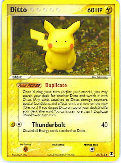 | Type | Lightning | | Pokemon serie | Delta Species | | Stadie | Basic | | HP | 60 | | Sjældenhed | Uncommon | | Tilbagetrækning | 1 | | Svaghed | F | | Kortnummer | 39 | | Evne | on it are now on the new Pokemon.) If you do, put Ditto on top of your deck. Shuffle your deck afterward. You can't use more than 1 Duplicate Poke-Power each turn. (Poke-POWER)