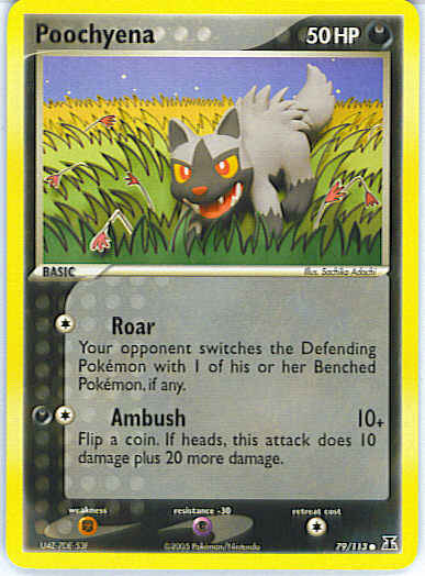 | Type | Darkness | | Pokemon serie | Delta Species | | Stadie | Basic | | HP | 50 | | Sjældenhed | Common | | Tilbagetrækning | 1 | | Modstand | P | | Svaghed | F | | Kortnummer | 79 | | Evne | [C] Roar - Your opponent switches the Defending Pokemon with 1 of his or her Benched Pokemon, if any. [CD] Ambush (10+) Flip a coin. If heads, this attack does 10 damage plus 20 more damage. | | Evne2 | [C] Roar - Your opponent switches the Defending Pokemon with 1 of his or her Benched Pokemon, if any. [CD] Ambush (10+) Flip a coin. If heads, this attack does 10 damage plus 20 more damage. | | Kunstner | Sachiko Adachi |