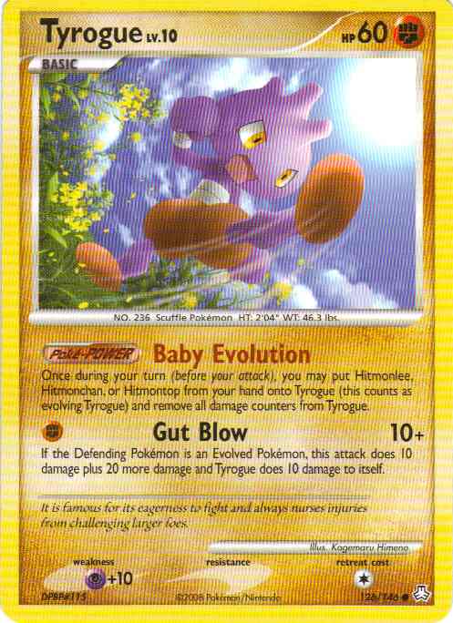 [F] Gut Blow (10+) If the Defending Pokemon is an Evolved Pokemon, this attack does 10 damage plus 20 more damage and Tyrogue does 10 damage to itself.