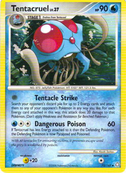 | Type | Water | | Pokemon serie | Legends Awakened | | Stadie | Stage 1 | | HP | 90.0 | | Sjældenhed | Uncommon | | Tilbagetrækning | 1.0 | | Svaghed | L+20 | | Kortnummer | 75 | | Evne | [0] Tentacle Strike - Search your opponent's discard pile for up to 2 Energy cards and attach them to any of your opponent's Pokemon in any way you like. For each Energy card attached in this way, this attack does 20 damage to that Pokemon. (Don't apply Weakness and Resistance for Benched Pokemon.) [CCW] Dangerous Poison (60) If Tentacruel has less Energy attached to it than the Defending Pokemon, the Defending Pokemon is now Paralyzed and Poisoned.