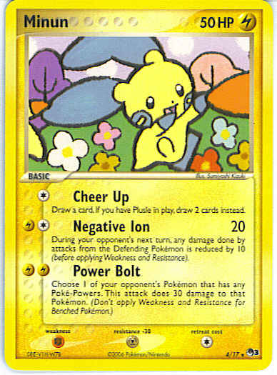 | Type | Lightning | | Pokemon serie | OP Series 3 | | Stadie | Basic | | HP | 50 | | Sjældenhed | Rare | | Tilbagetrækning | 1 | | Modstand | M | | Svaghed | F | | Kortnummer | 4 | | Evne | [C] Cheer Up - Draw a card. If Plusle is in play, draw 2 cards instead. [CL] Negative Ion (20) During your opponent's next turn, any damage done by attacks from the Defending Pokemon is reduced by 10 (before applying Weakness and Resistance). [LL] Power Bolt - Choose 1 of your opponent's Pokemon that has any Poke-Powers. This attack does 30 damage to that Pokemon. (Don't apply Weakness and Resistance for Benched Pokemon.)