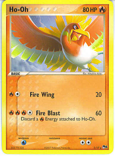 | Type | Fire | | Pokemon serie | OP Series 5 | | Stadie | Basic | | HP | 80 | | Sjældenhed | Rare | | Tilbagetrækning | 2 | | Svaghed | W | | Kortnummer | 1 | | Evne | [CR] Fire Wing (20) [CRRR] Fire Blast (60) Discard a R Energy attached to Ho-Oh.