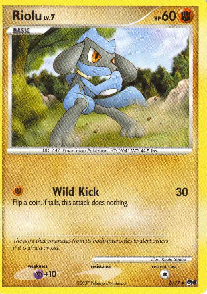 | Type | Fighting | | Pokemon serie | OP Series 6 | | Stadie | Basic | | HP | 60 | | Sjældenhed | Uncommon | | Tilbagetrækning | 1 | | Svaghed | P+10 | | Kortnummer | 8 | | Evne | [F] Wild Kick (30) Flip a coin. If tails, this attack does nothing.