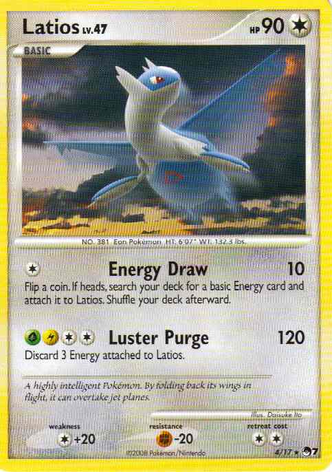 | Type | Colorless | | Pokemon serie | OP Series 7 | | Stadie | Basic | | HP | 90.0 | | Sjældenhed | Rare | | Tilbagetrækning | 2.0 | | Modstand | F-20 | | Svaghed | C+20 | | Kortnummer | 4 | | Evne | [C] Energy Draw (10) Flip a coin. If heads, search your deck for a basic Energy card and attach it to Latios. Shuffle your deck afterward. [CCGL] Luster Purge (120) Discard 3 Energy attached to Latios.