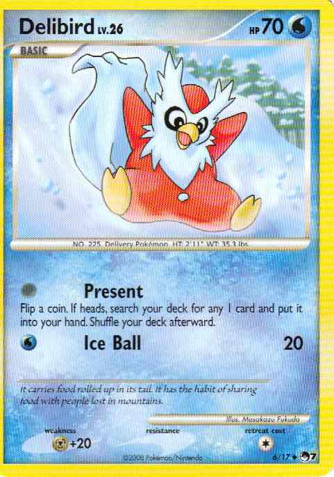 | Type | Water | | Pokemon serie | OP Series 7 | | Stadie | Basic | | HP | 70.0 | | Sjældenhed | Uncommon | | Tilbagetrækning | 1.0 | | Svaghed | M+20 | | Kortnummer | 6 | | Evne | [0] Present - Flip a coin. If heads, search your deck for any 1 card and put it into your hand. Shuffle your deck afterward. [W] Ice Ball (20)