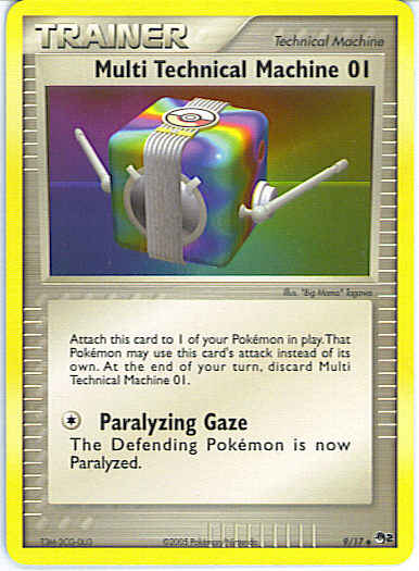 | Type | Trainer | | Pokemon serie | OP Series 2 | | Stadie | Trainer (Technical Machine) | | Sjældenhed | Uncommon | | Kortnummer | 9 | | Evne |