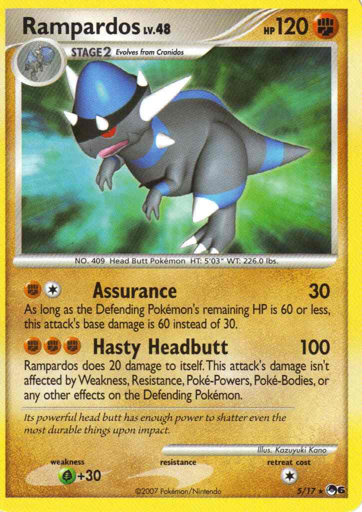 | Type | Fighting | | Pokemon serie | OP Series 6 | | Stadie | Stage 2 | | HP | 120 | | Sjældenhed | Rare | | Tilbagetrækning | 1 | | Svaghed | G+30 | | Kortnummer | 5 | | Evne | [CF] Assurance (30) As long as the Defending Pokemon's remaining HP is 60 or less, this attack's base damage is 60 instead of 30. [FFF] Hasty Headbutt (100) Rampardos does 20 damage to itself. This attack's damage isn't affected by Weakness, Resistance, Poke-Powers, Poke-Bodies, or any other effects on the Defending Pokemon.