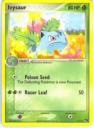 | Type | Grass | | Pokemon serie | OP Series 2 | | Stadie | Stage 1 | | HP | 80 | | Sjældenhed | Uncommon | | Tilbagetrækning | 1 | | Svaghed | P | | Kortnummer | 7 | | Evne | [C] Poison Seed - The Defending Pokemon is now Poisoned. [CGG] Razor Leaf (50)