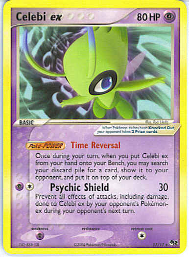| Type | Psychic | | Pokemon serie | OP Series 2 | | Stadie | Basic | | HP | 80 | | Sjældenhed | Ultra-Rare | | Tilbagetrækning | 1 | | Svaghed | P | | Kortnummer | 17 | | Evne | [CP] Psychic Shield (30) Prevent all effects of attacks, including damage, done to Celebi ex by your opponent's Pokemon-ex during your opponent's next turn.