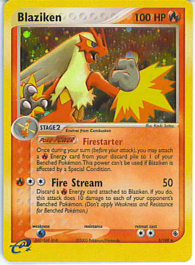 | Type | Fire | | Pokemon serie | Ruby Sapphire | | Stadie | Stage 2 | | HP | 100 | | Sjældenhed | Rare | | Tilbagetrækning | 2 | | Svaghed | W | | Kortnummer | 3 | | Evne | [CCR] Fire Stream (50) Discard a R Energy card attached to Blaziken. If you do, this attack does 10 damage to each of your opponent's Benched Pokemon. (Don't apply Weakness and Resistance for Benched Pokemon.)