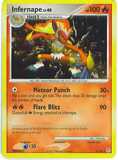 | Type | Fire | | Pokemon serie | Diamond and Pearl | | Stadie | Stage 2 | | HP | 100 | | Sjældenhed | Rare | | Svaghed | W+30 | | Kortnummer | 5 | | Evne |