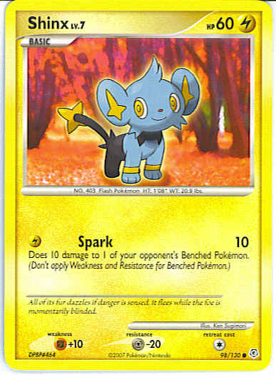 | Type | Lightning | | Pokemon serie | Diamond and Pearl | | Stadie | Basic | | HP | 60 | | Sjældenhed | Common | | Tilbagetrækning | 1 | | Modstand | M-20 | | Svaghed | F+10 | | Kortnummer | 98 | | Evne |