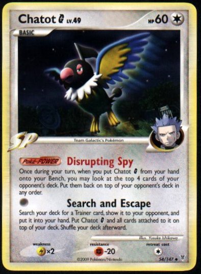 Search and Escape - Search your deck for a Trainer card, show it to your opponent and put it into your hand. Put Chatot G and all cards attached to it on top of your deck. Shuffle your deck afterward.