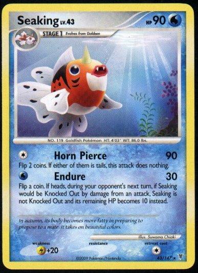 [W] Endure (30) Flip a coin. If heads, during your opponent's next turn, if Seaking would be Knocked Out by damage from an attack, Seaking is not Knocked Out and its remaining HP becomes 10 instead.