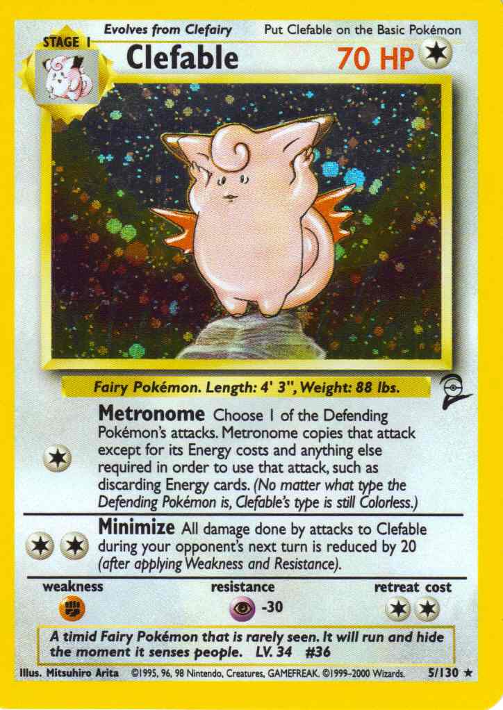 [C] Metronome - Choose 1 of the Defending Pokemon's attacks. Metronome copies that attack except for its Energy costs and anything else required in order to use that attack, such as discarding Energy cards. (No matter what type the Defending Pokemon is, Clefable's type is still Colorless.)