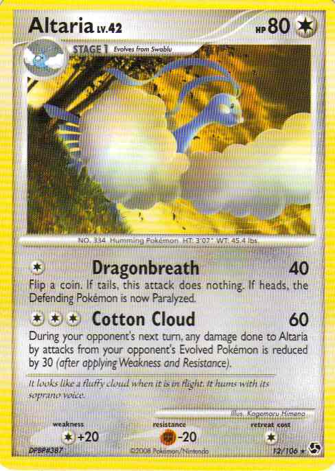 | | Evne2 | [C] Dragonbreath (40) Flip a coin. If tails, this attack does nothing. If heads, the Defending Pokemon is now Paralyzed. [CCC] Cotton Cloud (60) During your opponent's next turn, any damage done to Altaria by attacks from your opponent's Evolved Pokemon is reduced by 30 (after applying Weakness and Resistance).