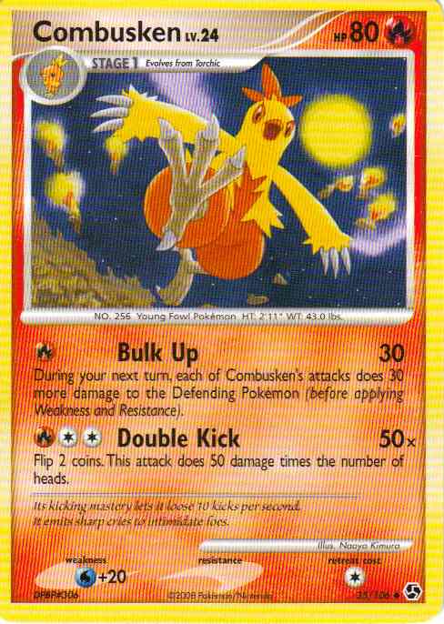 | Type | Fire | | Pokemon serie | Great Encounters | | Stadie | Stage 1 | | HP | 80.0 | | Sjældenhed | Uncommon | | Tilbagetrækning | 1.0 | | Svaghed | W+20 | | Kortnummer | 35 | | Evne | [R] Bulk Up (30) During your next turn, each of Combusken's attacks does 30 more damage to the Defending Pokemon (before applying Weakness and Resistance). [CCR] Double Kick (50x) Flip 2 coins. This attack does 50 damage times the number of heads.