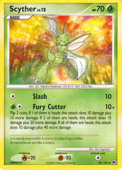 | Type | Grass | | Pokemon serie | Majestic Dawn | | Stadie | Basic | | HP | 70.0 | | Sjældenhed | Uncommon | | Tilbagetrækning | 1.0 | | Modstand | F-20 | | Svaghed | R+20 | | Kortnummer | 46 | | Evne | [C] Slash (10) [CG] Fury Cutter (10+) Flip 3 coins. If 1 of them is heads, this attack does 10 damage plus 10 more damage. If 2 of them are heads, this attack does 10 damage plus 20 more damage. If all of them are heads, this attack does 10 damage plus 40 more damage.
