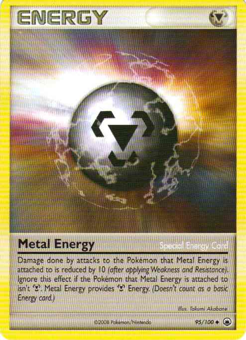 Evne Damage done by attacks to the Pokemon that Metal Energy is attached to is reduced by 10 (after applying Weakness and Resistance). Ignore this effect if the Pokemon that Metal Energy is attached to isn't M. Metal Energy provides M Energy. (Doesn't count as a basic Energy card.) (Major text change in Ruby/Sapphire. Using earlier versions requires reference.)