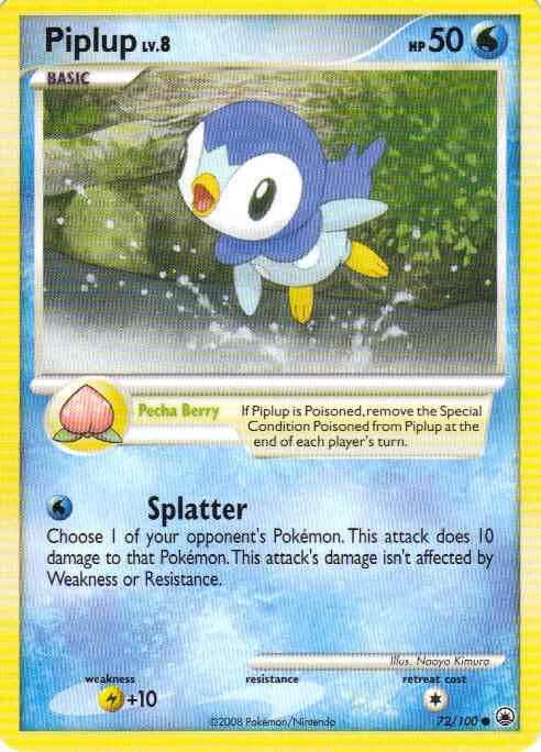 | Type | Water | | Pokemon serie | Majestic Dawn | | Stadie | Basic | | HP | 50.0 | | Sjældenhed | Common | | Tilbagetrækning | 1.0 | | Svaghed | L+10 | | Kortnummer | 72 | | Evne | [W] Splatter - Choose 1 of your opponent's Pokemon. This attack does 10 damage to that Pokemon. This attack's damage isn't affected by Weakness or Resistance.