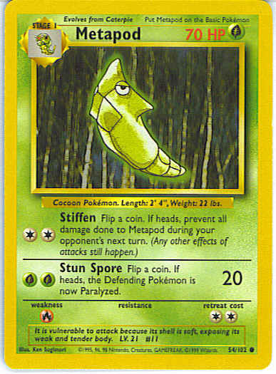 [CC] Stiffen - Flip a coin. If heads, prevent all damage done to Metapod on opponent's next turn. (any other effects of attacks still happen.)