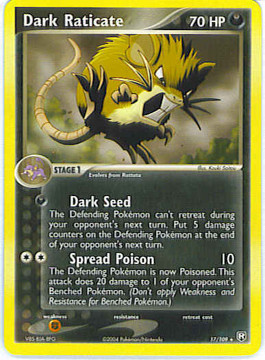 | Evne | [D] Dark Seed - The Defending Pokemon can't retreat during your opponent's next turn. Put 5 damage counters on the Defending Pokemon at the end of your opponent's next turn. [CC] Spread Poison (10) The Defending Pokemon is now Poisoned. This attack does 20 damage to 1 of your opponent's Benched Pokemon. (Don't apply Weakness and Resistance for Benched Pokemon.) |
