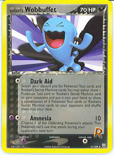 | Type | Darkness | | Pokemon serie | Team Rocket Returns | | Stadie | Basic | | HP | 70 | | Sjældenhed | Uncommon | | Tilbagetrækning | 1 | | Svaghed | P | | Kortnummer | 47 | | Evne | [C] Dark Aid - Search your discard pile for Pokemon Tool cards and Rocket's Secret Machine cards. You may either show 1 Pokemon Tool card or Rocket's Secret Machine card to your opponent and put it into your hand, or show a combination of 3 Pokemon Tool cards or Rocket's Secret Machine cards to your opponent and shuffle them into your deck. [CP] Amnesia (10) Choose 1 of the Defending Pokemon's attacks. That Pokemon can't use that attack during your opponent's next turn. | | Evne2 | [C] Dark Aid - Search your discard pile for Pokemon Tool cards and Rocket's Secret Machine cards. You may either show 1 Pokemon Tool card or Rocket's Secret Machine card to your opponent and put it into your hand, or show a combination of 3 Pokemon Tool cards or Rocket's Secret Machine cards to your opponent and shuffle them into your deck. [CP] Amnesia (10) Choose 1 of the Defending Pokemon's attacks. That Pokemon can't use that attack during your opponent's next turn. | | Kunstner | Mitsuhiro Arita |
